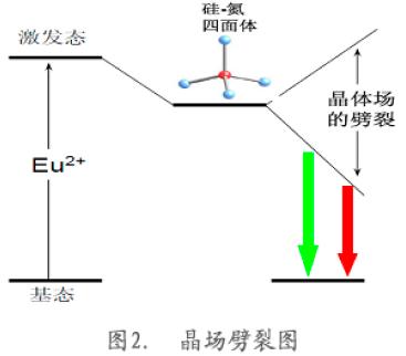 图1.是一些氮氧化物荧光粉的发射光谱[5],由于氮氧化物荧光粉是以具有较强共价键特性的硅-氮氧四面体作为其基本单元并构成一定的三维网络结构,因此在晶体场作用下,发光中心离子的电子组态出现大的晶场劈裂(如图2),使其激发和发射能量同时下降,从而实现了蓝光激发和红、绿、黄色发光。同时由于基质材料的共价键性较强,所以氮(氧)化物荧光粉具有热稳定性好、光衰小、温度特性好的特点。