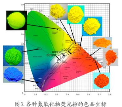 国内氮氧化物荧光粉的开发起步较晚,但是发展速度很快。现在已经面市的有氮氧化物红色、绿色、黄色、蓝色荧光粉,如图3为各产品在CIE坐标图中的色品坐标位置。