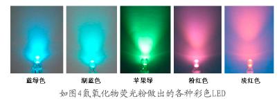 1.以前在可见光区域短波段500-530nm和长波段620-700nm只能通过芯片发光实现蓝色、绿色、红色发光,现在可以通过蓝光激发氮氧化物荧光粉实现各种颜色的发光。目前市场上能够发红色、绿色、蓝色的发光二极管(LED)全部依赖红色、绿色、蓝色芯片发光,其可以实现的颜色区域非常小,发光颜色单调,而且高亮红色、绿色芯片价格昂贵,使得多彩LED一直没有好的解决方案。本公司开发的高效、低光衰、可被蓝光激发的发光波长覆盖470-700nm的各种颜色氮氧化物荧光粉就彻底解决了目前多彩LED所面临的问题。蓝光芯片配合各种颜色的氮氧化物荧光粉可以发出发光波长覆盖500-700nm的各种光色。如图4为北京宇极芯光光电技术有限公司采用蓝色、绿色、红色氮氧化物荧光粉做出的各种彩色LED。