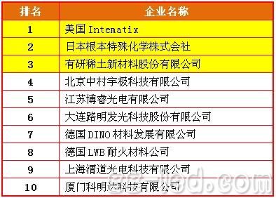 江苏博睿光电有限公司排行第五。江苏博睿是专业从事新型光电材料相关技术研究和开发应用的企业,在荧光粉领域,已形成科研开发、规模生产和专业化技术服务 的完整体系。江苏博睿现有员工40余人,硕士以上员工共计8人,申请发明专利近20项,在国内外学术刊物上发表文章100余篇。公司主要产品包括:高亮度 白光LED用全波段荧光粉、等离子显示器(PDP)用三基色荧光粉、冷阴极荧光灯(CCFL)用荧光粉、紧凑型灯(CFL)用荧光粉及多色系超长余辉蓄光 型荧光粉等。该公司荧光粉目前在华东一带份额较大,而在珠江三角洲从去年开始也慢慢渗透。据LED封装业内工程技术人士透露,该公司荧光粉质量还不错,加 上价格上的部分优势,部分小型封装企业慢慢青睐该公司荧光粉。