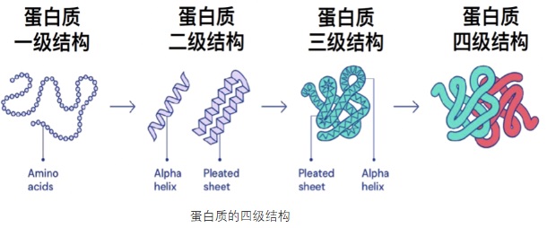 一级结构:即氨基酸序列的组合;二级结构,即蛋白质分子中某一段肽链的局部空间结构;三级结构,即在二级结构基础上多段进一步折叠盘绕后形成的特定空间结构;四级结构,即蛋白质-蛋白质复合形成的结构,是更为复杂的生物大分子。